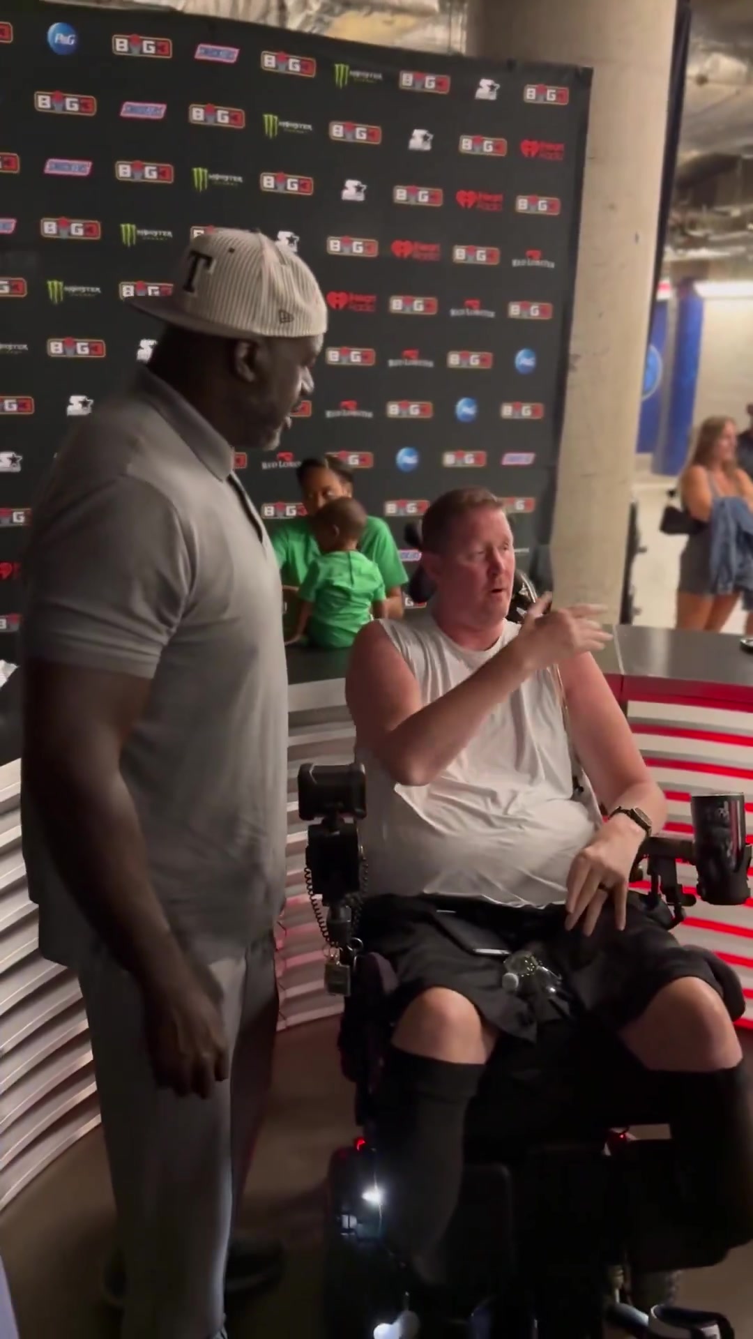 08月18日讯 前NBA球员、53 岁的“大竹竿”肖恩-布拉德利坐轮椅观战Big3联赛,一双小腿已经截肢。